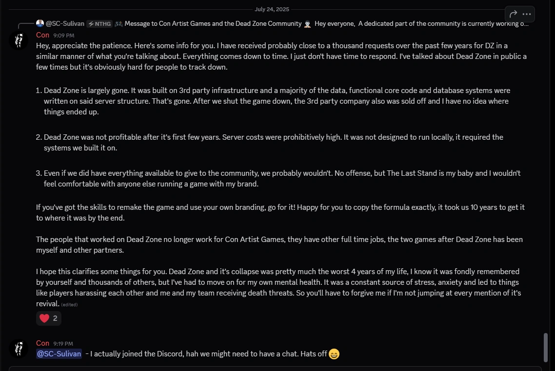 In July 2025, Chris Condon, known as Con, of Con Artist Games, authorized us to proceed with the project to revive the game, provided we met the requirement of not monetizing it.